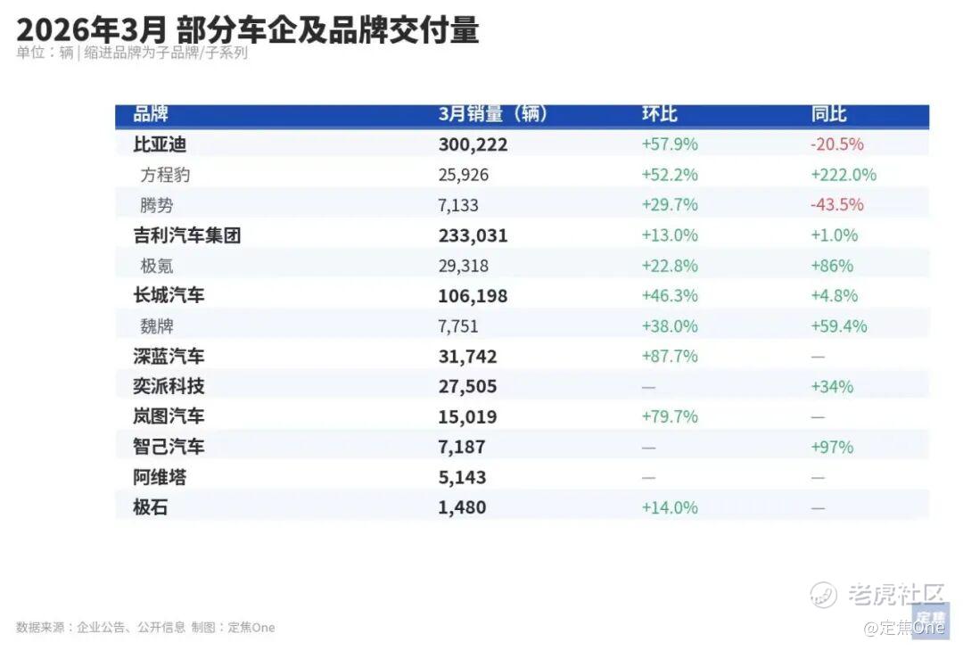 3月大盘当然还是传统巨头撑起来的。比亚迪3月卖出30.02万辆,环比上涨57.9%,一季度累计交付70万辆,稳居行业第一,其中,王朝海洋网仍是基本盘,方程豹、腾势3月分别交付25926辆、7133辆。吉利以23.3万辆紧随其后,旗下极氪品牌单月交付近3万辆(29318辆)。长城汽车同样开始回暖,单月销量10.6万辆,其中魏牌贡献了7751辆。