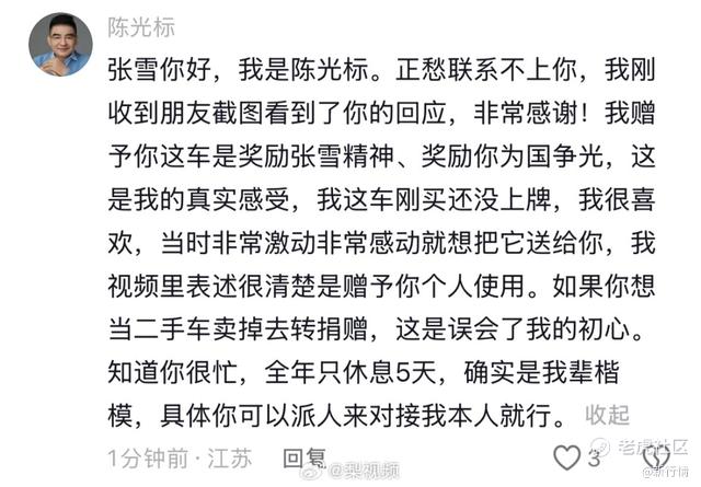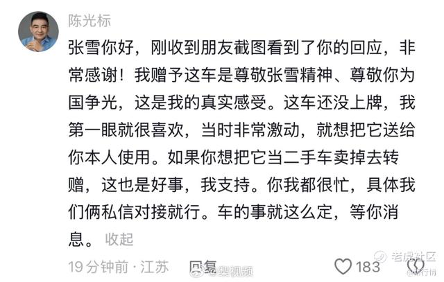 随后,他有删除了留言,换了个表述:“我赠予这车是尊敬张雪精神、尊敬你为国争光,这是我的真实感受。这车还没上牌,我第一眼就很喜欢,当时非常激动,就想把它送给你本人使用。如果你想把它当二手车卖掉去转赠,这也是好事,我支持。你我都很忙,具体我们俩私信对接就行。车的事就这么定,等你消息。”
