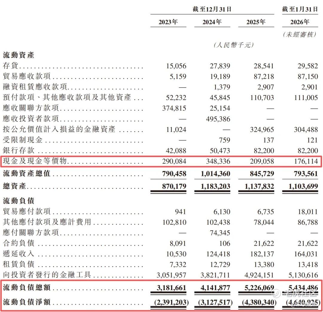 在营运资本方面,公司的现金储备偏低,截至2026年1月31日,银行存款和现金及其等价物合计2.58亿元。同时,公司的流动负债水平非常高,截至同期,流动负债总额为54.34亿元,流动负债净额为46.40亿元。