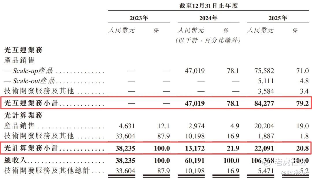 公司的收入结构以光互连为主,占比近80%,其中Scale-up产品于2025年的收入7558万元,是核心营收来源;光计算为高增长第二曲线,相关营收持续提升。