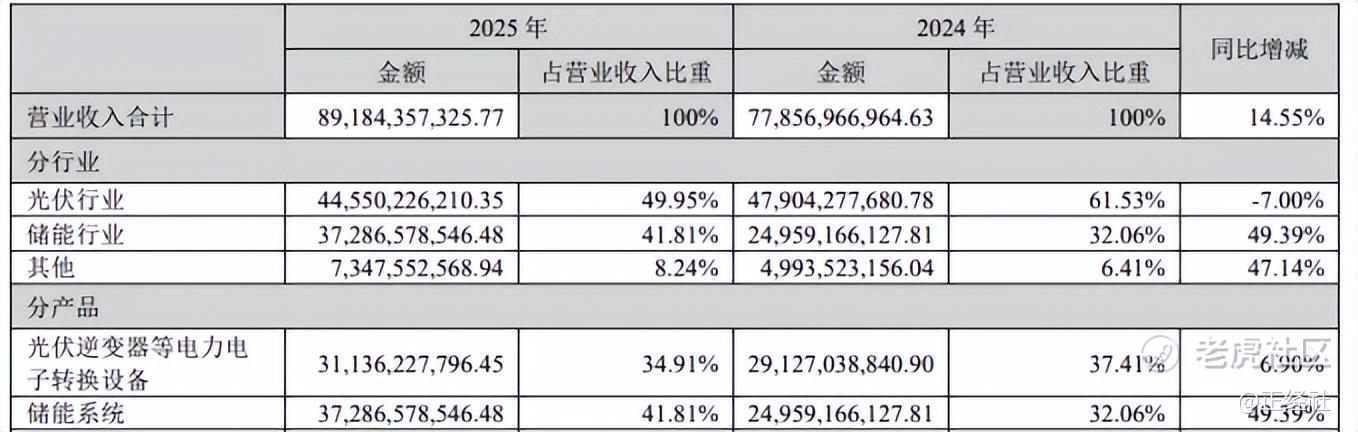2025年,阳光电源储能系统业务营收372.87亿元,同比猛增49.39%,占总营收比重从32.06%跃升至41.81%,正式超越光伏逆变器,成为公司第一大业务板块。