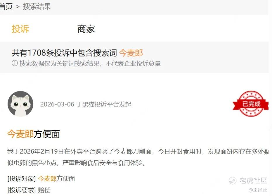 与此同时,黑猫投诉平台上有关“今麦郎”的投诉量已超过1700条,消费者反映在产品中吃出蜘蛛、虫卵等异物的事件屡见不鲜。