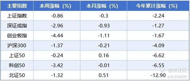 本周(3月30日至4月3日),A股三大指数延续调整。截至周五收盘,上证指数累计下跌0.86%,深证成指累计下跌2.96%,创业板指累计下跌4.44%。