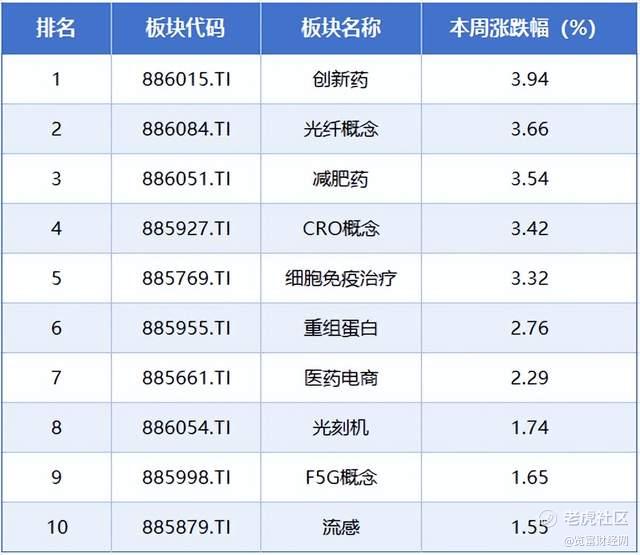 板块方面,本周涨幅居前的概念板块分别是创新药、光纤概念、减肥药、CRO概念、细胞免疫治疗,累计涨幅分别为3.94%、3.66%、3.54%、3.42%、3.32%。