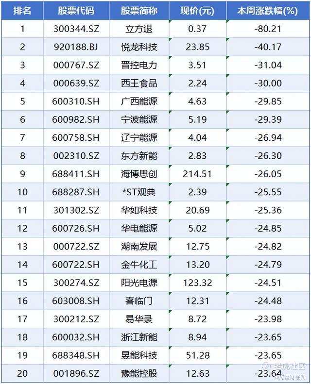 本周个股跌幅榜前五位分别是立方退、悦龙科技、晋控电力、西王食品、广西能源,累计跌幅分别为80.21%、40.17%、31.04%、30%、29.85%。