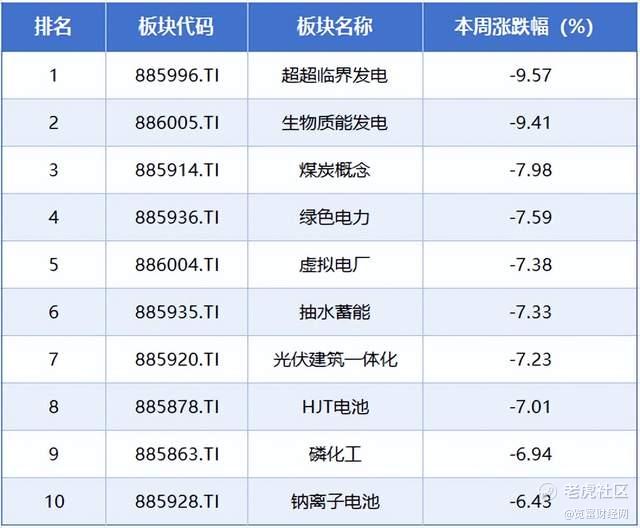 本周排在跌幅榜前排的概念板块分别是超超临界发电、生物质能发电、煤炭概念、绿色电力、虚拟电厂,累计跌幅分别为9.57%、9.41%、7.98%、7.59%、7.38%。