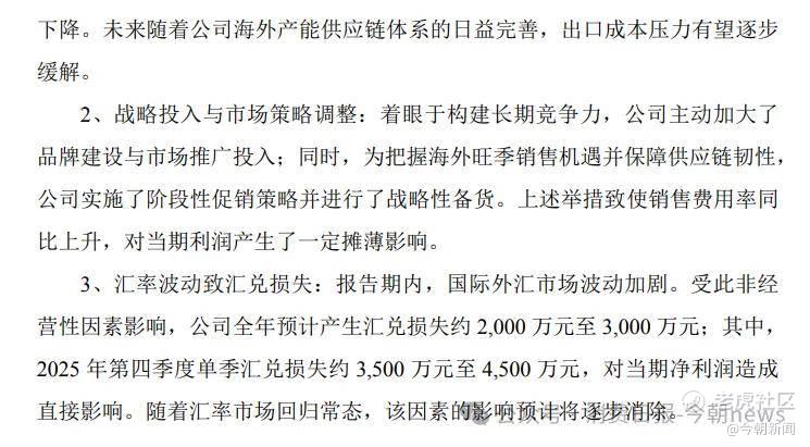 更值得注意的是,非经常性的汇兑损失在四季度集中爆发。2025年国际外汇市场剧烈波动,公司全年预计产生2000万-3000万元汇兑损失,而四季度单季汇兑损失便高达3500万-4500万元,远超全年归母净利润规模。