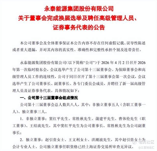 4月2日,永泰能源召开2026年第一次临时股东大会,会议审议通过董事会换届相关议案,选举产生第十三届董事会。