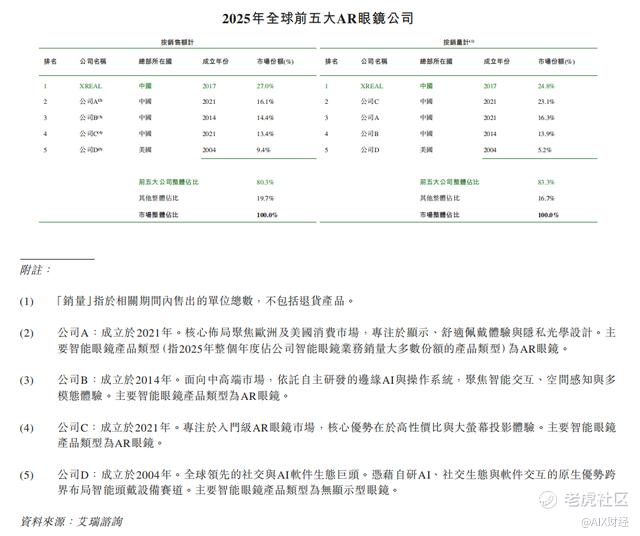 根据招股书附注,排名第二的公司成立于2021年,专注欧洲及美国市场,可能为Viture;排名第三的公司成立于2014年,主要面向中高端市场,可能为Rokid;排名第四的公司成立于2021年,主打入门级产品,可能为雷鸟创新;排名第五的美国公司成立于2004年,是全球领先的AI软件生态巨头,可能为Meta。