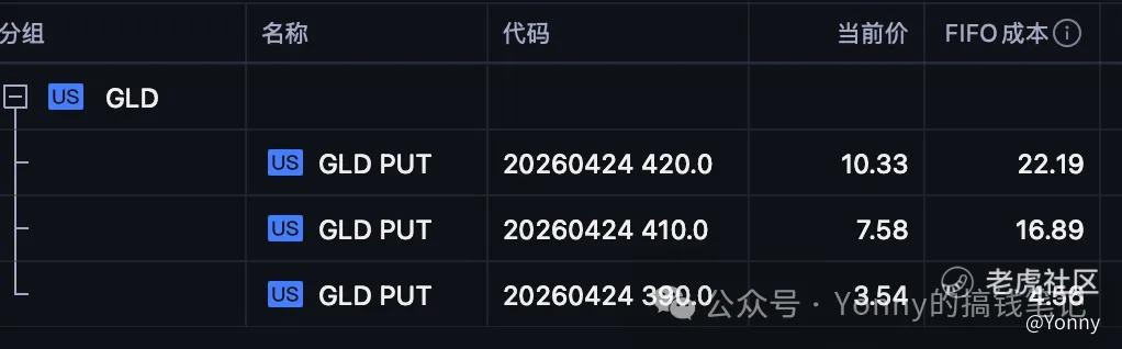 3️⃣ $420关口:我的sell put $420距离当前价格只有$9,安全垫不算厚。如果GLD再来一波急跌,这个仓位可能需要做风控——要么roll到更远期,要么认亏平仓。