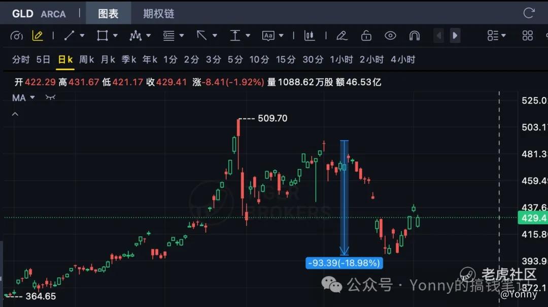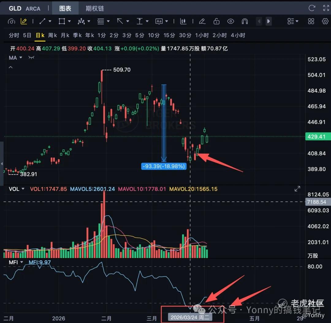 机构方面,高盛3月21日的最新报告维持年底$5400/oz的目标价,但也提示短期仍有下行风险;JPMorgan 2月更新的预测更激进,年底目标$6300/oz。换算成GLD大约对应$496-$578。如果$400的底部能站住,那当前$429的位置,理论上往上的空间还是比往下的要大些。