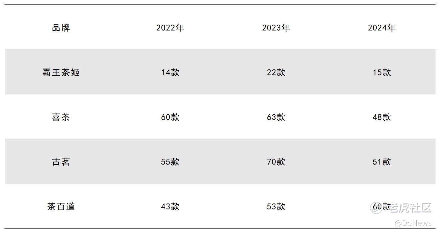 公开数据印证了加盟商的这份无奈:2025年年初至12月初,霸王茶姬在全国范围内仅上新8款产品,6月之后更是仅上新4款,其中两款还是“伯牙绝弦”的迭代版本。拉长时间周期来看,2022年至2024年,喜茶、古茗、茶百道等同行的年度上新数量,几乎是霸王茶姬的数倍之多。
