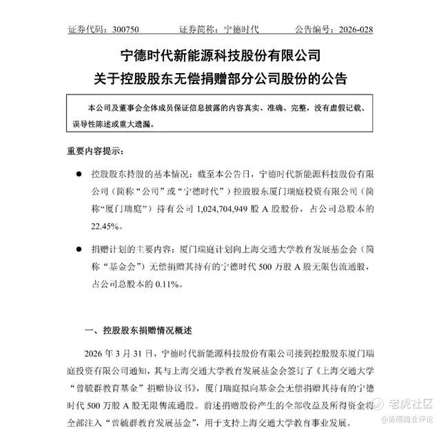 董事长曾毓群,将自己持有的500万股宁德时代无限售流通A股,无偿捐赠给上海交通大学教育发展基金会,按当日股价算,这笔捐赠市值直接突破20亿元,全部用于支持母校教育事业发展。