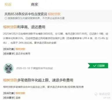 在黑猫投诉平台上,关于“榕树贷款”的投诉量已经超8500条。大量用户投诉该平台违规收取服务费,导致实际年化利率过高。有用户在该平台借款38000元,分12期归还,可实际所承担的年化利率却高达35%。