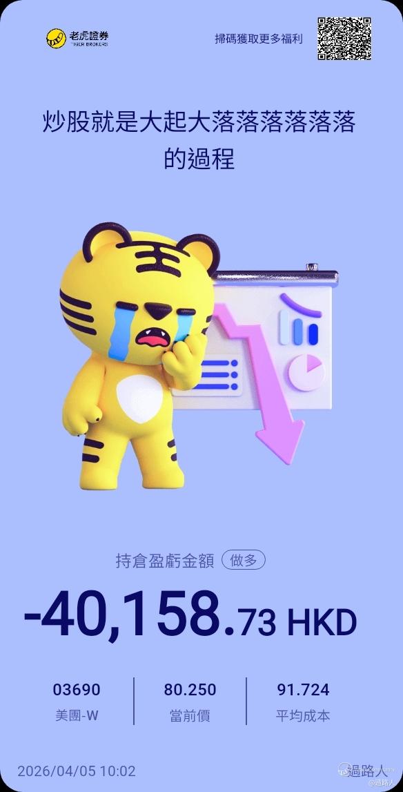 $美团-W(03690)$ 前几日表现真系值得一闹。大市升咁多都要跌。仲要系高开之后跌。。若非当日大市升500几点。应该不至跌升咁少。若持续回跌既话。我相信不少人要转行送外卖了。。星期四亦跟著大市下跌。大市升跌佢都跌。唔掂[汗颜]