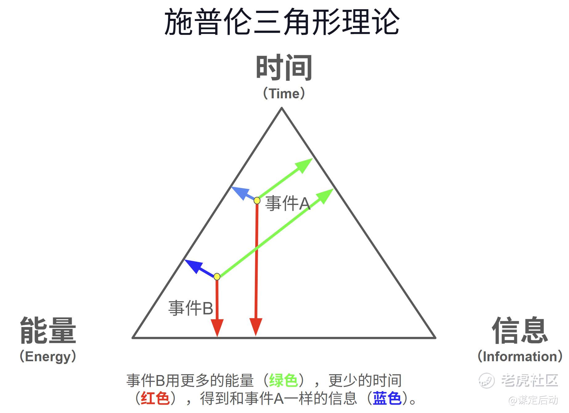原版的学术定义有点绕,我们直接把它翻译成投资和商业的语言。想象一个等边三角形,它的三个顶点分别代表我们做成一件事所需的三个核心资源:资本/物质(能量)、认知/情报(信息)、以及光阴/精力(时间)。