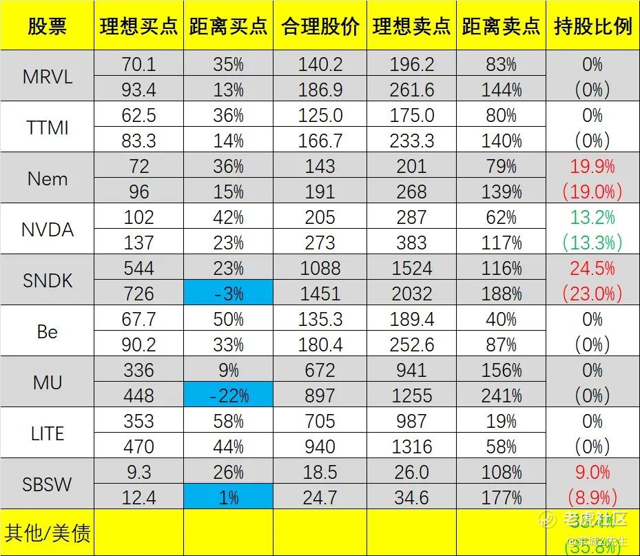 $英伟达(NVDA)$ 13.2%, $闪迪(SNDK)$ 24.5%, $纽曼矿业(NEM)$ 19.9%,SBSW 9.0%,现金/美债 33.4%。