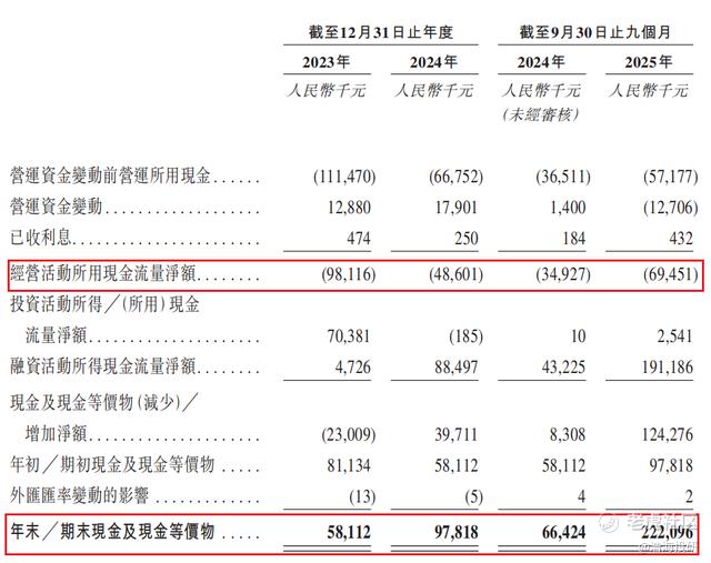 与持续亏损和高负债相伴而生的,是公司日益紧张的现金流。丹诺医药的经营性活动现金长期处于净流出状态,2023年净流出9812万元,2024年为4860万元,2025年前九个月再度扩大至6945万元。两年半累亏净流出超过2.1亿元。这种持续的“失血”状态,使得公司的现金储备不断消耗,所有资金需求只能重度依赖外部融资。