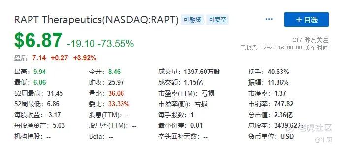 公司股价当日大涨64.02%,而在2024年,RAPT Therapeutics股价跌幅达93.64%。