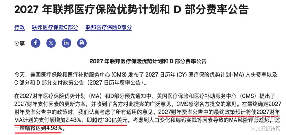 CMS 表示,这一最终方案对应的新增支付规模将超过 130亿美元。若再考虑风险评估相关调整,市场普遍测算行业总支付提振幅度接近 5%。