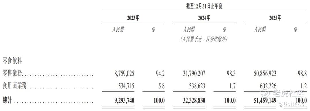 更新后的招股书显示,万辰集团的业务结构已发生根本性重塑。2025年,零食饮料零售业务收入为508.57亿元,占营收的比例高达98.8%,成为绝对的收入支柱。而曾经的核心业务食用菌业务收入占比仅为1.2%,彻底沦为边缘业务。这意味着,万辰集团已基本剥离食用菌业务,完成了从“食用菌第一股”到零食巨头的身份切换。