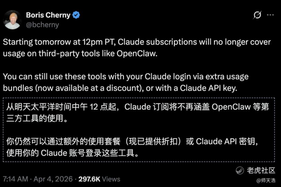 2026年4月4日,美国大模型头部公司Anthropic旗下AI 编程工具Claude Code负责人Boris Cherny发文称,美国西部时间4月4日中午12点起,Claude订阅服务将不再包含对Open Claw等第三方工具的使用额度。