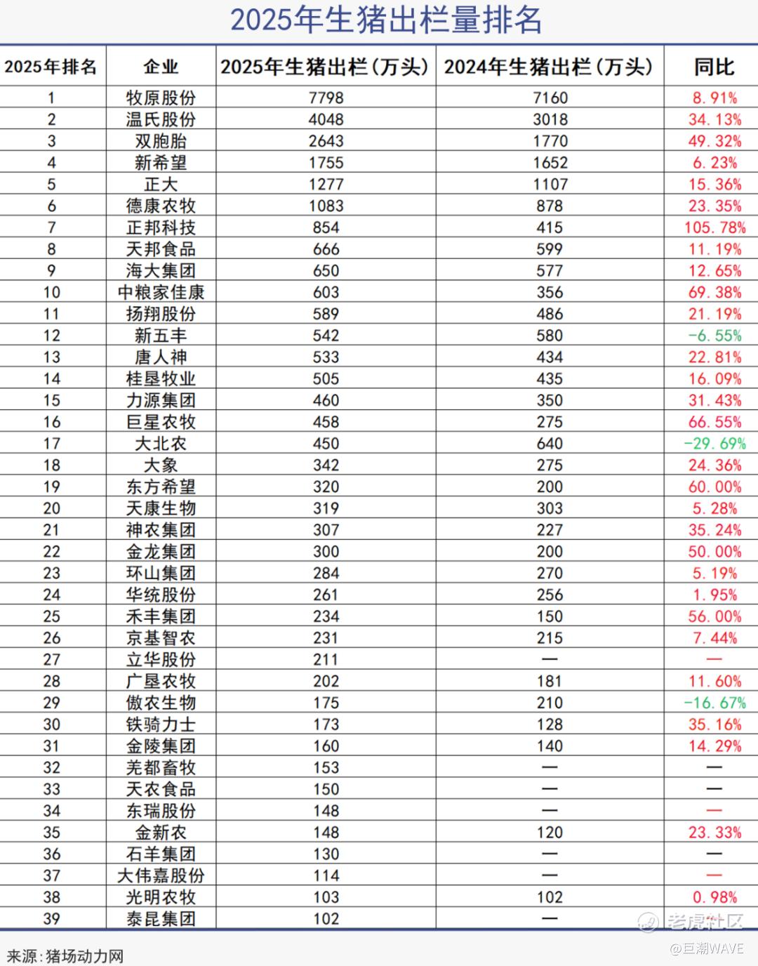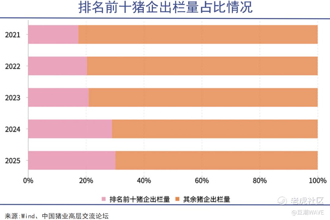 与此同时,行业进一步集中。去年出栏量超百万头的猪企达39家,同比增加7家,合计出栏2.95亿头,增长5800万头,增幅高达24.5%,这些头部企业的出栏量贡献了全国的41%,占比抬升9个百分点。
