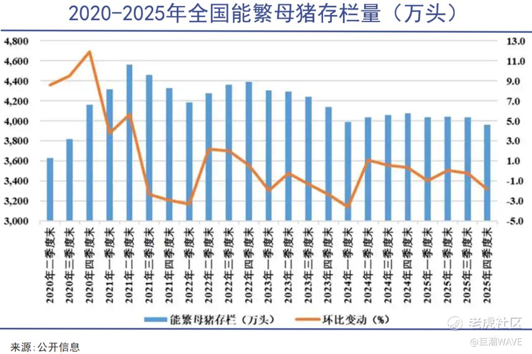 首先是供给端去化缓慢。能繁母猪存栏量是影响供给的核心指标,直接决定生猪出栏量。截至2025年底,我国能繁母猪存栏量降到3961万头(较前年去化116万头),但仍高于农业农村部3650万头的调控目标。