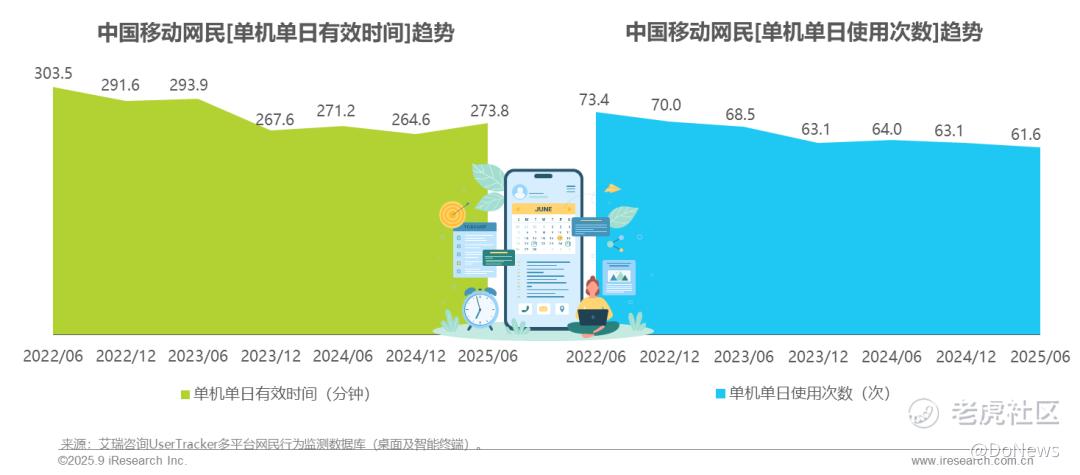 然而,这种精准推荐带来的极致体验,正出现边际效应递减。艾瑞咨询2025年发布中国移动互联网流量半年报显示,用户行为呈现出一种“量降质升”趋势:有效使用时间从303分钟降至273分钟,使用次数从73次降至61次。