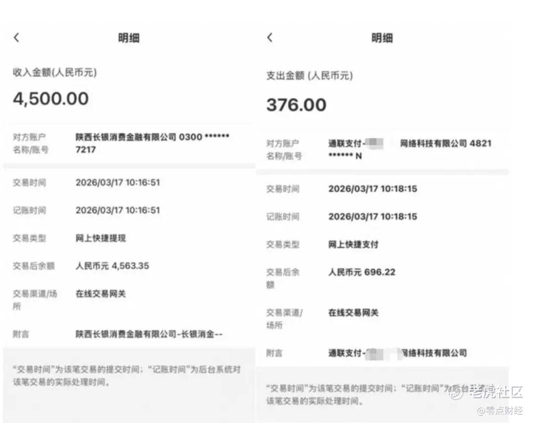 一名借款人讲述,其2026年3月17日在长银消金合作的第三方平台借款4500元,但当日亦被合作的通联支付—某网络科技有限公司扣除376元的会员费。