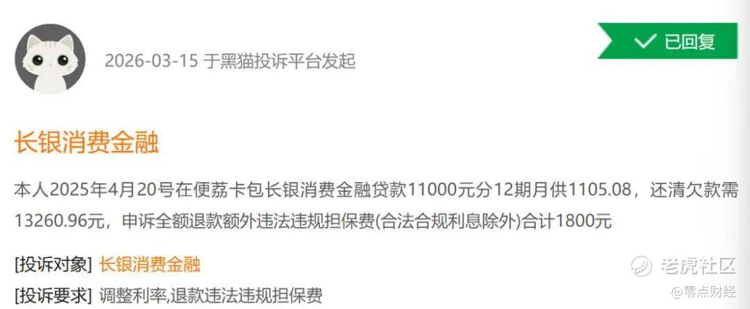 3月15日,一借款人表示2025年4月20日,通过一借贷平台向长银消金贷款11000元,分12期还款,月供1105.08元,还清所有贷款需13260.90元。