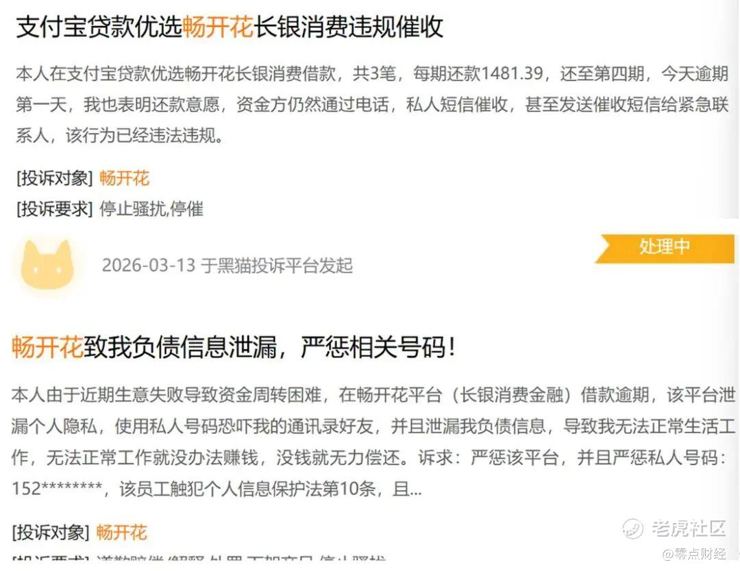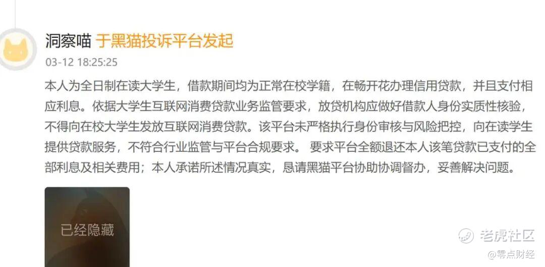 更为重要的是,3月12日,一名自称是学生的用户在黑猫投诉称其在校期间,成功办理了畅开花的信用贷款。