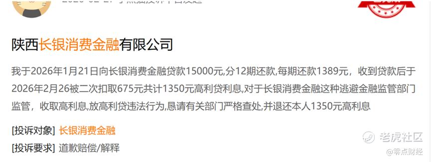 无独有偶,另一用户称今年1月21向长银消金贷款15000元,分12期还款,每期还款1389元,收到贷款后分别被扣除675元的费用,合计1350元,据此计算年化利率高达40.86%。