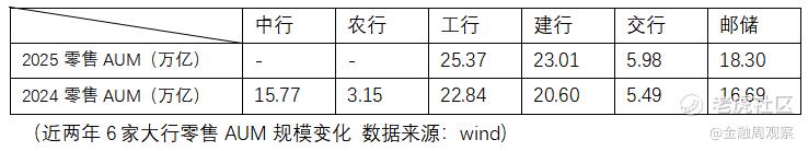 虽然6大行中仅有4家披露了2025年的零售AUM规模,无一例外都录得较高规模增长: