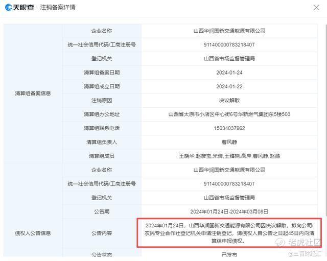 值得注意的是,此次股权转让方山西华润国新目前经营状态为停业。该公司此前曾在2024年1月因决议解散,向公司登记机关申请注销登记。