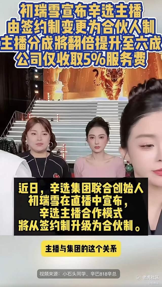 事实上,辛选内部也正在经历一场大的洗牌。自从初瑞雪接管辛选后,便大刀阔斧地调整了辛选的运营模式。最关键的变化是把传统签约制改成了合伙制,主播以独立企业的身份与辛选合作,自己做法人、做CEO,自负盈亏。主播的分成比例也直接翻倍到60%,辛选只收约5%的服务费,辛选彻底从管理者退到服务商的位置,专心做供应链和资源赋能,不再介入主播的具体运营事务。