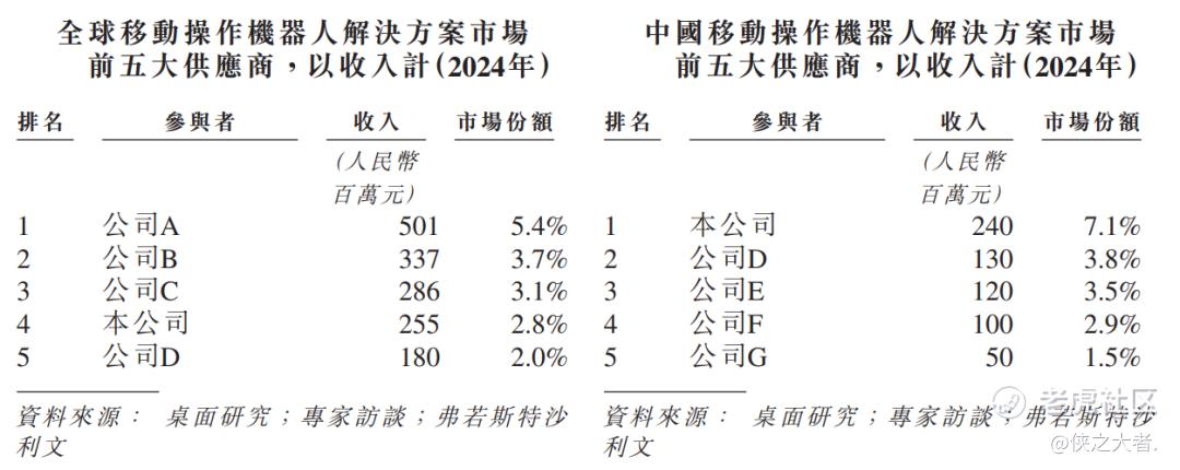 以2024年收入计,公司是全球移动操作机器人解决方案市场第四大参与者,占据2.8%的市场份额。同时公司是中国移动操作机器人解决方案市场最大的参与者,占据7.1%的市场份额。