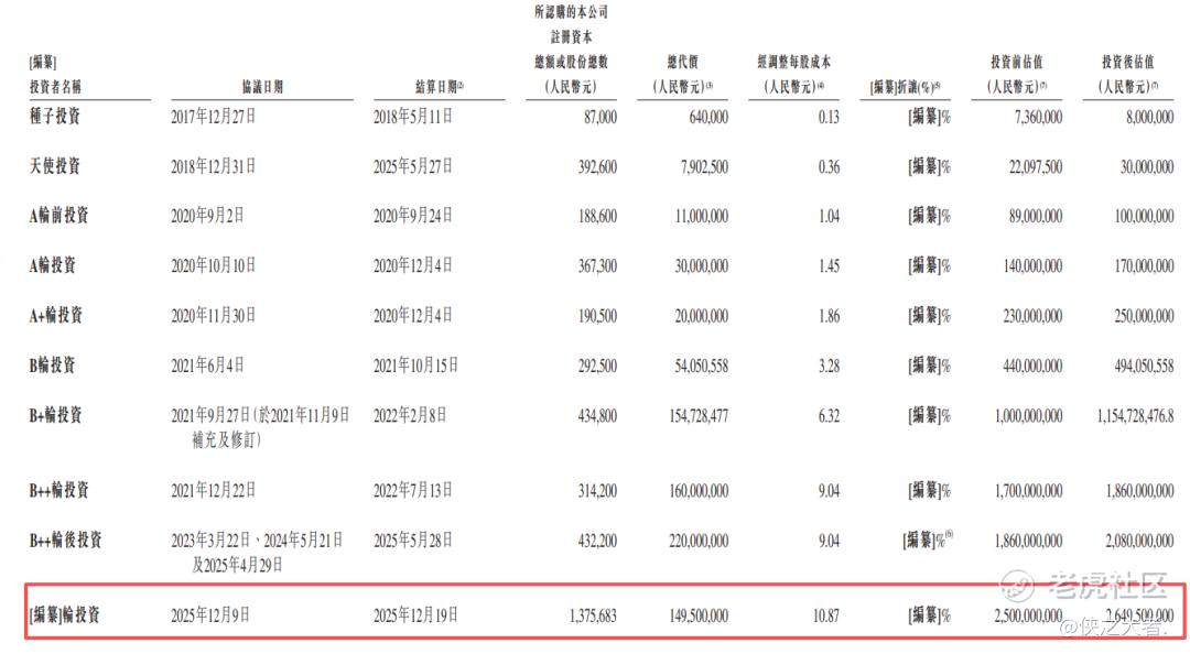 公司上市前经历了多轮融资。截至2025年12月,公司最后一轮投后估值约为26.5亿人民币。