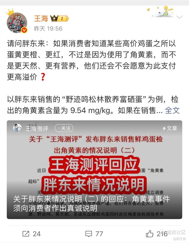 没想到,王海这边也没怂,继续质问:如果消费者知道高价鸡蛋之所以蛋黄更橙、更红,是因为使用了角黄素,而不是更天然、更有营养,他们还会不会愿意为此支付更高溢价?胖东来是否有涉及对消费者的误导?