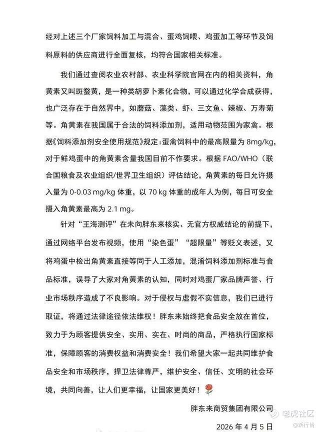 因此,胖东来表示,针对“王海测评”在未向胖东来核实,无官方权威结论的前提下,通过网络平台发布视频,误导了大家对角黄素的认知,对鸡蛋厂家品牌声誉、行业市场秩序造成了不良影响。对于侵权与虚假不实信息,已进行取证,将通过法律途径依法维权。