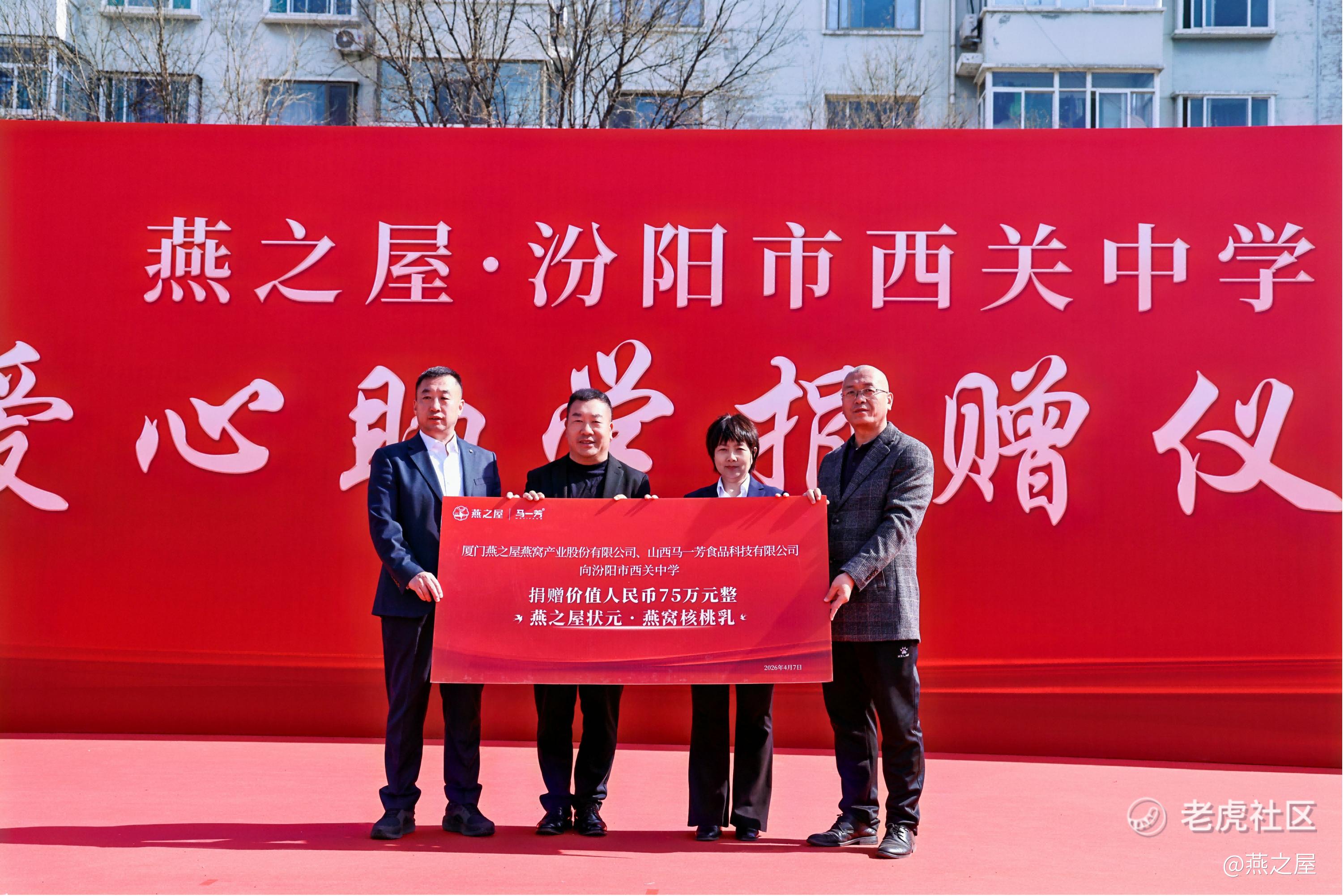 4月7日,燕之屋执行董事兼总裁李有泉回到母校汾阳市西关中学,出席爱心助学捐赠仪式,向学校捐赠价值75万元的燕之屋状元·燕窝核桃乳及10万元专项奖学金,以实际行动反哺家乡、助力教育事业发展,彰显新时代民营企业家的责任与担当。