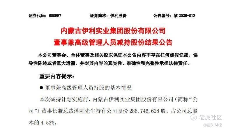 近日,伊利股份(600887.SH)发布公告显示,公司收到董事长兼总裁潘刚出具的《减持股份结果告知函》,潘刚通过集中竞价交易方式减持公司股份6199.03万股,套现16.43亿元。