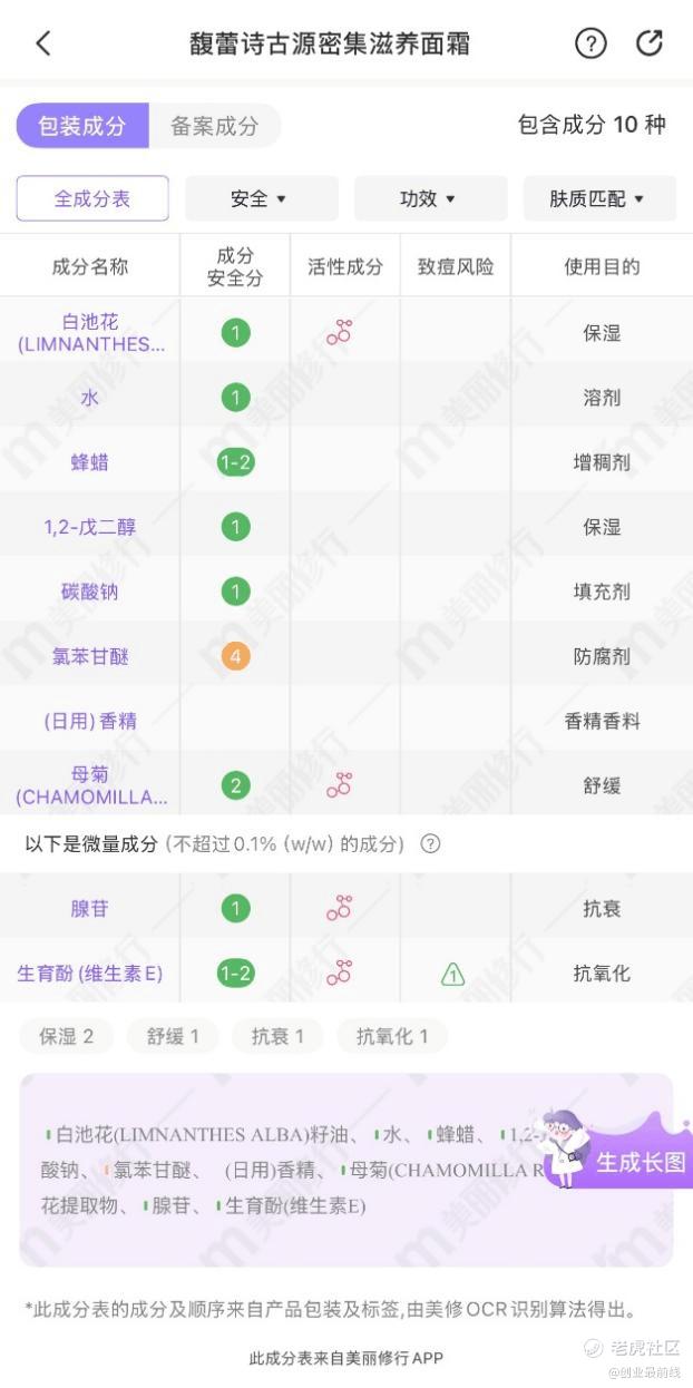 而从核心成分来看,修女面霜只有10个成分,主要为白池花籽油、蜂蜡和洋甘菊腊,以及抗衰、抗氧化的腺苷、维生素E等微量成分。产品优势在于成分简单,但同时也添加了防腐剂氯苯甘醚。