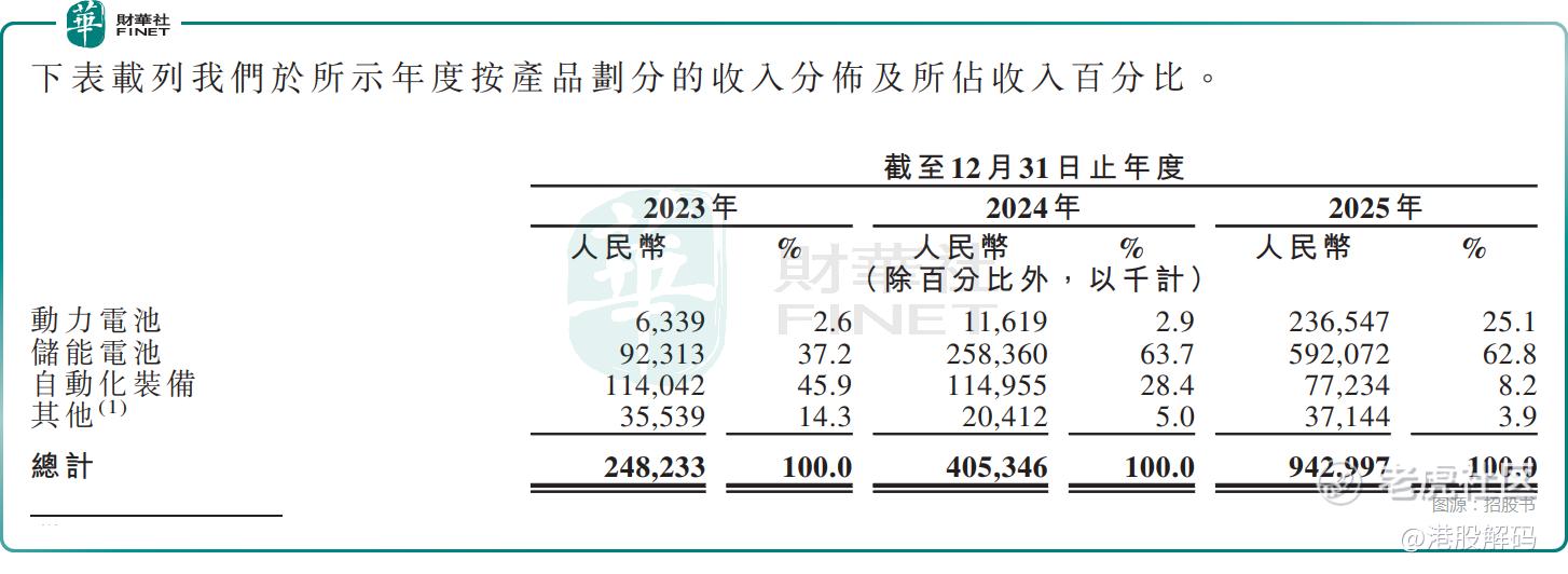 清陶能源的收入主要来源于动力及储能系统两大领域,亦有一部分收入来自销售用于电池生产及其他制造领域的自动化装备。数据显示,2023年至2025年,公司的动力电池业务收入从633.9万元增至2.37亿元,占总收入的比重也从2.6%提升至25.1%,储能电池的收入也大幅增长至5.92亿元,占总收入比重为62.8%,是增长核心支柱。