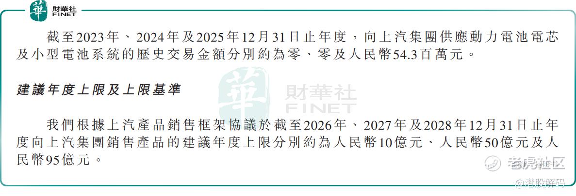 招股书显示,清陶能源的固态电池产品已搭载于上汽旗下智己、名爵(MG)及福田等知名汽车OEM逾30款乘用车、商用车车型,交付超过1.68万套。另外,清陶能源根据上汽产品销售框架协议于2026年、2027年及2028年向其销售产品的建议年度上限分别为10亿元(人民币,下同)、50亿元和95亿元。