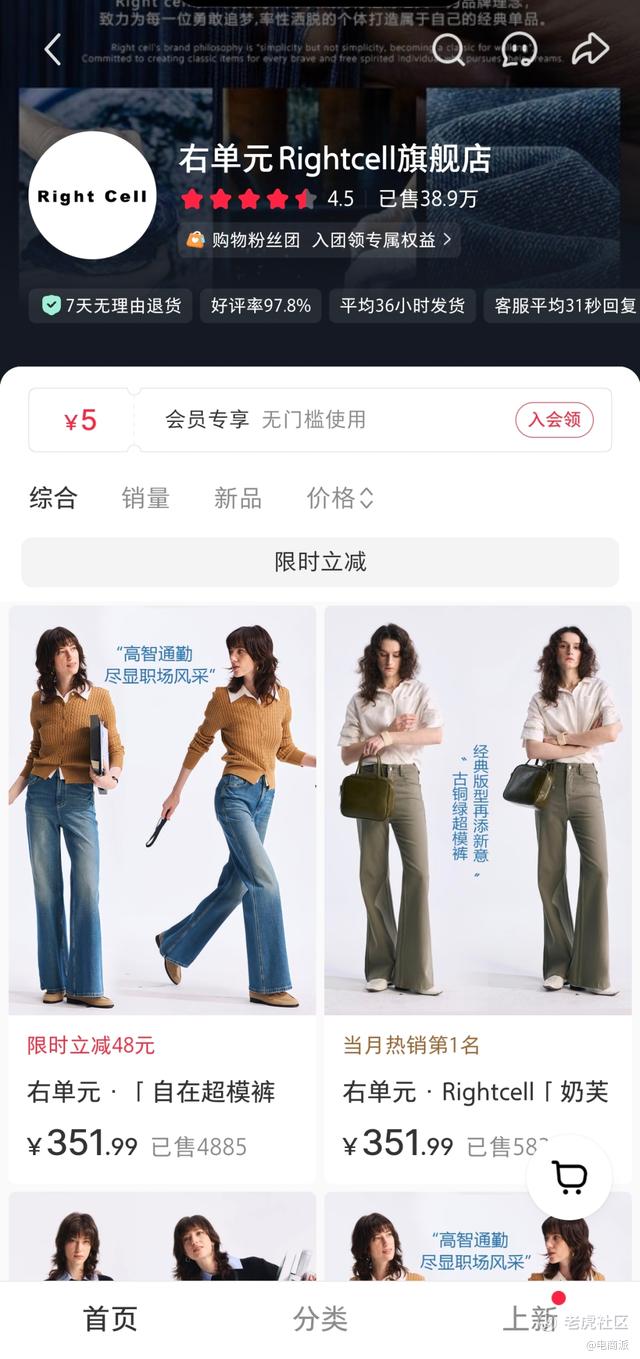 另一个令人印象深刻的品牌是牛仔裤商家Rightcell(右单元)。这个由95后女生创立的品牌,背靠佛山产业带,2024年6月入驻小红书后,通过对用户身材痛点的深度洞察,将牛仔裤细分为32个规格、8个尺码,代表单品“超模裤”一年卖出18万条,成为小红书裤装垂类头部商家。