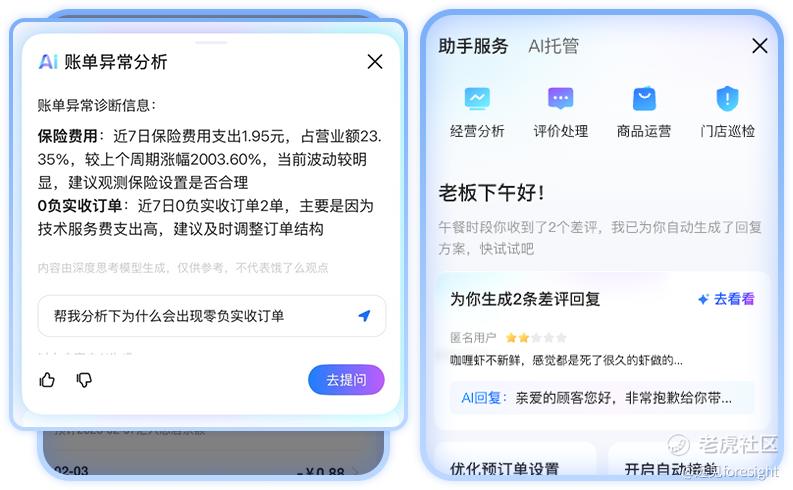目前,AI 店铺助手主动服务体系在助手首页、全局气泡以及和垂直场景联动的自嵌入AI悬浮窗等多场景支撑。服务涵盖履约、营销活动、经营成长、账单分析、顾客评价等多形态场景,覆盖商家规模已超百万。