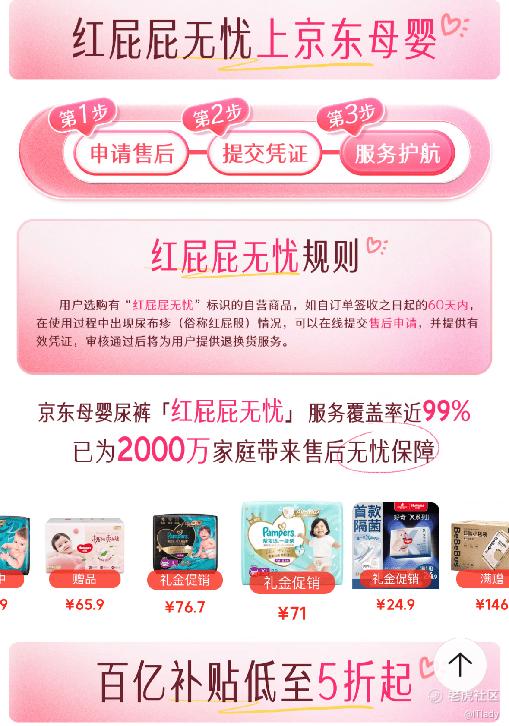 除了纸尿裤品质,相关服务的升级也是缓解新手父母焦虑的关键一环。作为国内规模领先的超市,京东超市持续关注消费者的育儿难题。针对宝宝“红屁屁”问题,京东超市早在多年前就推出了“红屁屁无忧”服务。消费者购买提供该服务的纸尿裤商品后,若宝宝在使用过程中,屁屁出现泛红、红肿、颗粒、结痂等现象,只需提供有效凭证即可享受免费退换货服务,让新手父母无需担心买错或使用后出现问题造成的损失,真正实现放心选购。