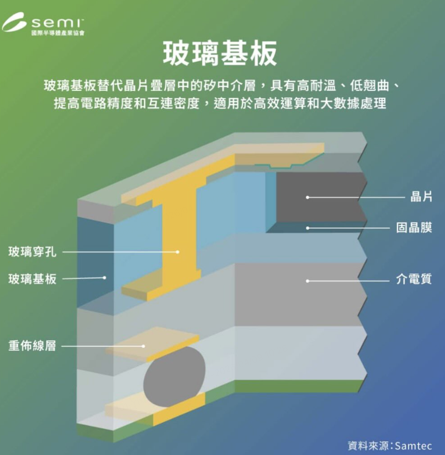 玻璃基板以其优异热稳定性、超低表面粗糙度(平整度远高于有机材料)、以及与矽相近的热膨胀系数,成为突破瓶颈的核心选择。其低介电常数与低损耗特性,更支援更高频讯号传输与细微线宽线距设计,适合高密度异质整合需求。
