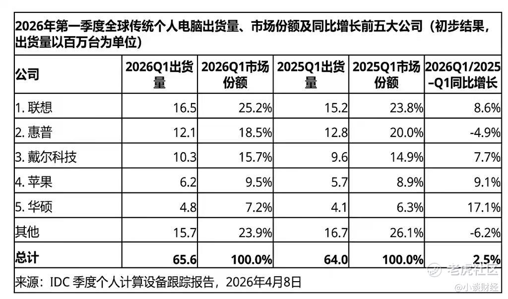 $联想集团(00992)$ IDC刚刚出炉的Q1全球PC市场出货数据。在内存供应持续紧张、中东局势推高运费、美洲市场逆势下滑的多重逆风下,全球PC市场增长势头存在明显回落。但TOP五大厂商中,联想以1650万台出货量,份额冲到了25.2%,同比大增8.6%,属五大厂商中增长最突出的,稳坐全球第一。